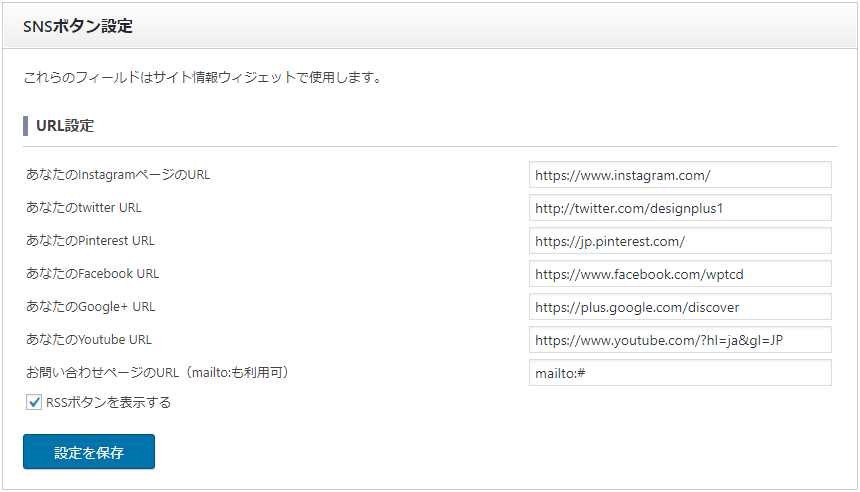 その一環として、テーマオプションから自分のTwitterやFacebook(Facebookページも可)、Instagramのアカウントを設定することにより、投稿記事やニュース記事にソーシャルボタンの表示が可能です。その他Pinterest、Google+まで幅広いメディアに対応しています。