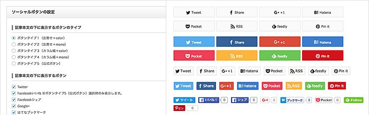 表示させるボタンも任意で選択して頂けるようになっています。とくにソーシャルとの連携が必要ないサイトであればあえて非表示にする方もいます。
