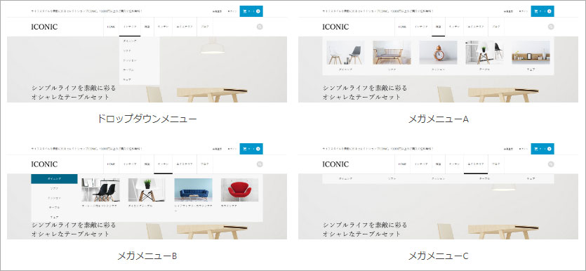 当テーマではグローバルメニューで、通常のドロップダウンメニューに加え、3種類のメガメニューを選択することができます。