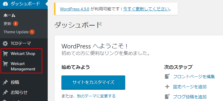 加えて、ECサイトに関する内容(商品登録~顧客管理対応など)は「Welcart」をプラグインとして有効化することで編集・運用管理をすることができるようになります。
